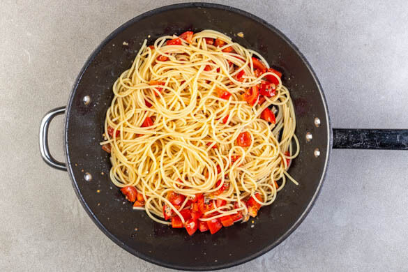 Das Pastawasser, die Tomaten sowie den Käse in die Pfanne geben und rühren, bis der Käse geschmolzen ist. Die Sauce weitere 2–3Min. köcheln lassen und mit 1 Prise Salz abschmecken.