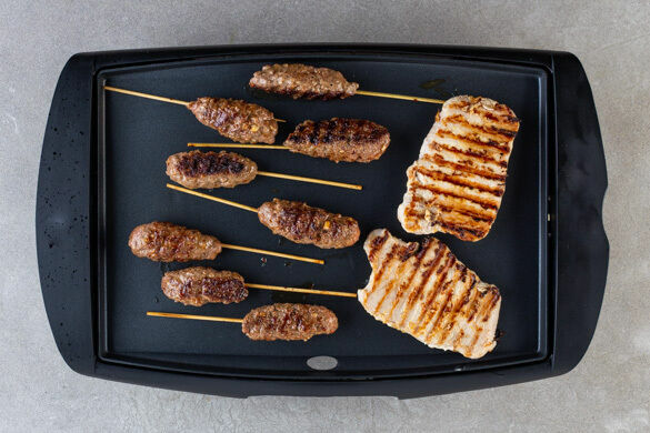 Die Steaks und die Spieße nach Belieben z. B. mit einem leckeren Bulgur- oder Kichererbsensalat oder Brot und Hummus anrichten und servieren.