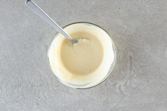 Die Zitronenschale abreiben, dann die Zitrone halbieren und auspressen. Den Zitronenabrieb und 2–3EL Zitronensaft mit der 1/2 der Tahinipaste, 1EL Olivenöl, 1EL Wasser und 1–2 Prisen Salz verrühren.