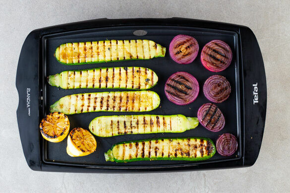 Die Zucchini bei mittlerer Hitze 6–8Min. auf dem Grill oder in einer Grillpfanne garen, dabei einmal wenden. Die Zwiebeln auf dem Grill oder in der Grillpfanne 5–6Min., die Zitronen mit den Schnittflächen nach unten 3–4Min. grillen, bis deutliche Röstspuren zu sehen sind.