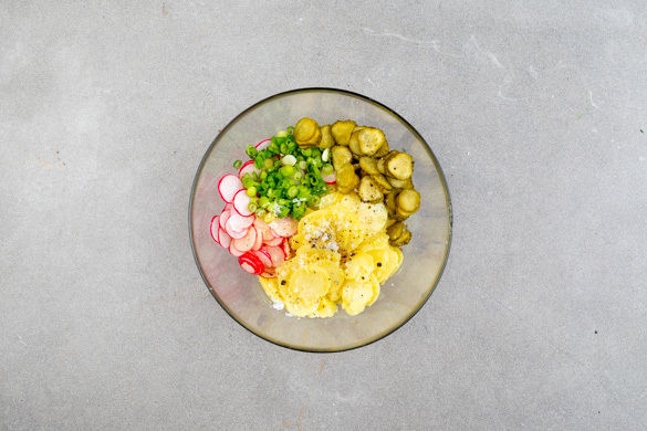 Die Kartoffeln in Scheiben schneiden und vorsichtig mit den Radieschen, den Lauchzwiebeln und dem Dressing vermengen. Den Salat noch einmal mit Essig, Salz und Pfeffer abschmecken und mit dem Backhendl servieren.
