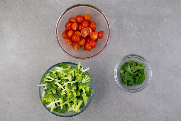 In einem mittelgroßen Topf ausreichend gesalzenes Wasser für die Pasta zum Kochen bringen. Den Brokkoli in mundgerechte Röschen schneiden, dabei so viel Strunk wie möglich an den Brokkoliröschen lassen. Die Kirschtomaten halbieren. Die Sauerampferblätter abzupfen und grob schneiden.
