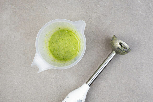 Inzwischen die Limettenschale abreiben, dann die Limetten halbieren und auspressen. Die restliche Ananas mit 2/3 des Korianders, 1–2TL Limettenabrieb, 2–3EL Limettensaft, 1–2EL Olivenöl, 1EL Essig sowie 1 Prise Salz und Pfeffer in einem hohen Gefäß zu einem cremigen Dressing pürieren. Ggf. mehr Ananassaft dazugeben, falls das Dressing zu dickflüssig ist.