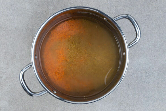 In einem großen Topf 1L Wasser zum Kochen bringen. Die Linsen, die 1/2 des Bulgurs und 1 kräftige Prise Salz in das kochende Wasser geben und die Linsen und den Bulgur in 10–12Min. fast weich kochen. Der restliche Bulgur wird für dieses Rezept nicht benötigt.