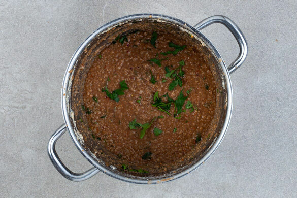 Die Linsen und den Bulgur in ein Sieb abgießen, gut abspülen und zurück in den Topf geben. Die Tomaten, die Zwiebelwürfel, das Tomatenmark, die Granatapfelmelasse und den Kreuzkümmel hinzugeben und alles mit einem Stabmixer nicht zu fein pürieren. Mit Salz und Pfeffer abschmecken und die 1/2 der Kräuter unterrühren.