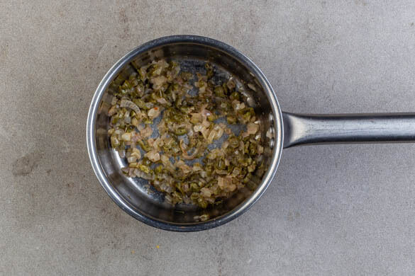 In einem kleinen Topf 1EL Butter bei mittlerer Hitze schmelzen. Die Schalotten in den Topf geben und ca. 1Min. anschwitzen, bis sie glasig und leicht bräunlich sind. Die Kapern hinzugeben und ca. 1Min. erwärmen.