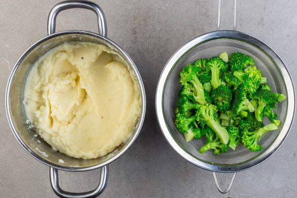 Die Kartoffeln in das kochende Wasser geben und 10–15Min. kochen. Den Brokkoli mit 1 kräftigen Prise Salz in eine hitzebeständige Schüssel geben. Mit einer Tasse etwas Kochwasser abschöpfen, das restliche Kochwasser über den Brokkoli gießen und bis zum Servieren ziehen lassen. Die Kartoffeln in ein Sieb abgießen, zurück in den Topf geben und abgedeckt warmhalten.