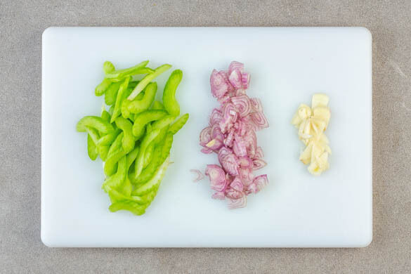 In einem Wasserkocher 1L Wasser zum Kochen bringen. Währenddessen die Zucchini quer in 0,5cm Scheiben schneiden. Den Sellerie in dünne Scheiben schneiden. Die Schalotten schälen, halbieren und grob würfeln. Den Knoblauch schälen und in feine Scheibchen schneiden.