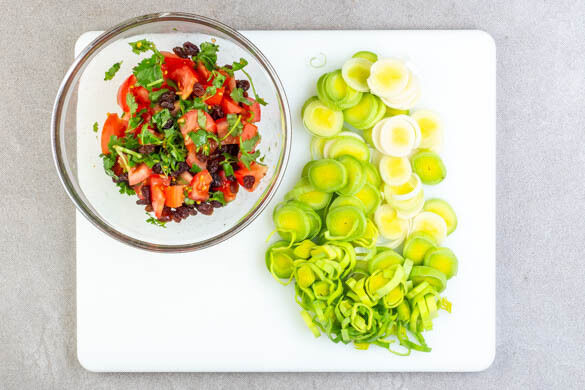 Den Koriander grob schneiden. Die Tomaten in ca. 1cm große Würfel schneiden. 1EL hellen Essig mit 1TL körnigem Senf und 1TL Honig verrühren und mit dem Koriander, den Tomaten und den Rosinen zu einem Salat vermengen. Den Lauch in dünne Ringe schneiden.
