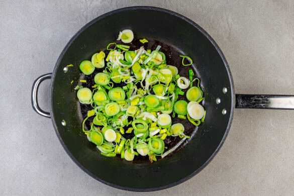 Die Mandeln in einer mittelgroßen Pfanne ohne Zugabe von Fett bei mittlerer Hitze in 1–2Min. goldbraun anrösten, herausnehmen und beiseitestellen. Den Lauch in der Pfanne mit 2EL Pflanzenöl und 1 Prise Salz bei mittlerer Hitze ca. 2Min. anbraten.