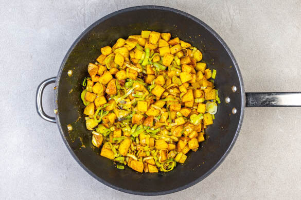 Die Kartoffeln dazugeben und 6–8Min. mitbraten. Das Currypulver während der letzten Minute zugeben und mitbraten.