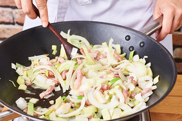 Den Speck, die Lauchzwiebeln und die Zwiebeln in einer mittelgroßen Pfanne ohne Zugabe von Fett 4–5Min. braten, bis der Speck knusprig ist und die Zwiebeln weich sind. Mit ca. 1EL Gewürzmischung sowie Salz und Pfeffer abschmecken. Die Speck-Zwiebel-Mischung auf einem Teller beiseitestellen. Die Pfanne aufbewahren.