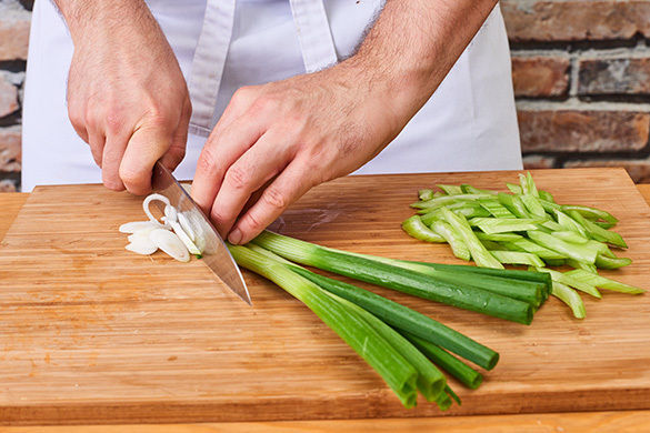 Den Sellerie in ca. 1cm breite Stücke schneiden. Die Lauchzwiebeln schräg in sehr feine Ringe schneiden. Den Knoblauch schälen und in feine Scheibchen schneiden.