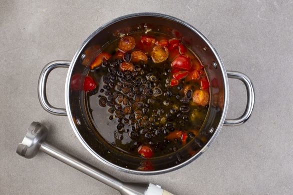 Die Paprika und die Zwiebeln in einem mittelgroßen Topf mit 1–2EL Olivenöl bei mittlerer Hitze 4–5Min. anbraten. Die Tomaten, den Knoblauch, die Chilihälfte, die 1/2 der Gewürzmischung und 1 Thymianstängel hinzugeben und alles ca. 10Min. köcheln lassen. Die 1/2 der Korianderblätter fein schneiden, die Stängel in der Suppe mitkochen.