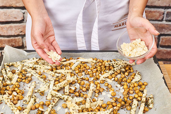 Ca. 5Min. vor Ende der Backzeit die Mandeln zu dem Sellerie aufs Blech geben und goldbraun mitrösten. Vorsicht, dass sie nicht zu dunkel werden. Den Sellerie und die Kichererbsen mit dem Salat anrichten und mit dem Joghurtdip servieren.