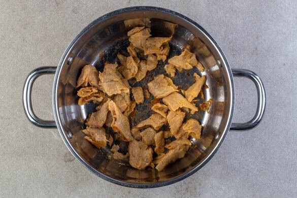 Die veganen Hähnchenschnetzel in einem mittelgroßen Topf mit 1EL Olivenöl bei mittlerer Hitze ca. 2Min. pro Seite anbraten, bis sie bräunlich sind. Aus dem Topf nehmen und beiseitestellen.