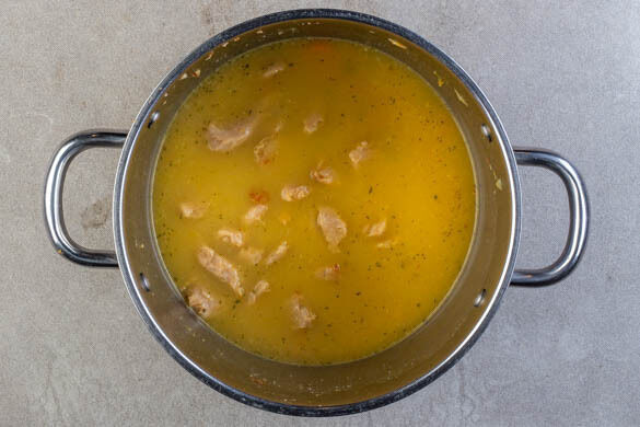 Den Thymian entfernen und die ½ des Gemüses ausschöpfen und reservieren. Das restliche Gemüse samt Flüssigkeit zu einer cremigen Suppe pürieren. Das reservierte Gemüse und die Schnetzel in den Topf geben. 150g Pasta und 250ml Wasser in den Topf geben und 5–6Min. kochen, bis die Pasta bissfest ist.