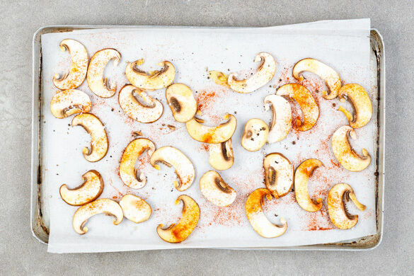 In einem großen Topf ausreichend gesalzenes Wasser für die Pasta aufkochen. Die Pilzstiele entfernen. Die Pilze in dünne Scheiben schneiden, auf einem mit Backpapier ausgelegten Blech mit 4EL Olivenöl, 1TL Paprikapulver sowie Salz und Pfeffer vermengen und 13–18Min. im Ofen rösten, zwischendurch einmal wenden. Dann abkühlen lassen, dabei werden die Pilze noch knuspriger.