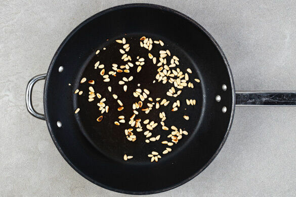Die Pinienkerne in einer großen Pfanne ohne Zugabe von Fett bei mittlerer Hitze 2–3Min. goldbraun anrösten, dabei stetig rühren. Vorsicht, die Pinienkerne können zu schnell zu dunkel werden. Zum Abkühlen auf einem Teller beiseitestellen.