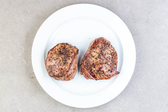 Die Hitze auf die mittlere Stufe reduzieren und mit einem Löffel mehrmals geschmolzene Butter über das Fleisch schöpfen. Noch 3–4Min. weiterbraten, abhängig davon, ob das Fleisch medium oder eher durchgebraten sein soll. Aus der Pfanne nehmen und bis zum Servieren auf einem Teller abgedeckt ruhen lassen. Die Pfanne auf dem Herd lassen und nicht auswischen.
