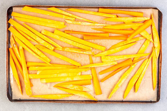 Die Süßkartoffeln und die Karotten mit 2EL Olivenöl und ½TL Salz vermengen und auf einem mit Backpapier ausgelegten Backblech verteilen. Im Ofen ca. 18Min. backen, bis die Pommes goldbraun und knusprig sind, dabei nach der Hälfte der Zeit wenden.