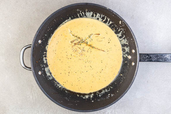Die Hitze auf die mittlere Stufe reduzieren und mit einem Löffel mehrmals geschmolzene Butter über die Steaks schöpfen. Noch 3–4Min. weiterbraten, abhängig davon, ob die Steaks medium oder eher durchgebraten sein sollen. Aus der Pfanne nehmen und bis zum Servieren auf einem Teller abgedeckt ruhen lassen. Die Pfanne auf dem Herd lassen und nicht auswischen.