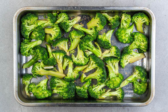 Inzwischen den Brokkoli in mundgerechte Röschen schneiden, mit 2EL Pflanzenöl, 2EL Balsamicoessig und 1 kräftigen Prise Salz vermengen, in eine Auflaufform geben und 12–14Min. im Ofen backen, bis Röstmarken entstehen.