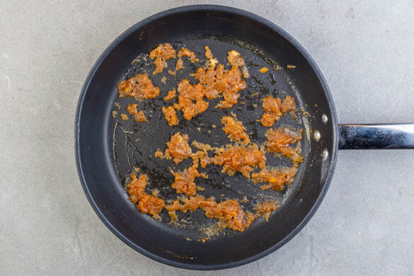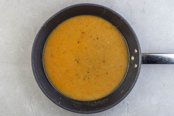 2EL Butter in der Pfanne bei mittlerer bis starker Hitze erwärmen. 2EL Mehl und das Chutney in die geschmolzene Butter geben und ca. 1Min. rühren, dann die restliche Gewürzmischung und die ½ des Brühgewürzes unterrühren.