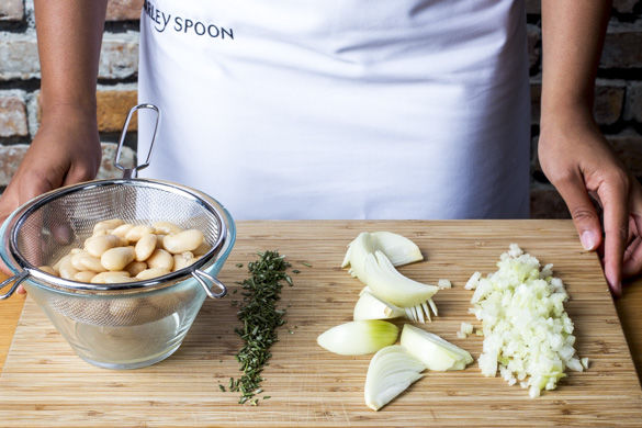 Den Backofen auf 220°C Umluft (240°C Ober-/Unterhitze) vorheizen. Die Zwiebeln schälen und halbieren. 3 Zwiebelhälften in feine Würfel, die übrigen 3 Hälften in breite Spalten schneiden. Die Rosmarinnadeln abzupfen und grob hacken. Die Bohnen in einem Sieb mit kaltem Wasser abspülen und gut abtropfen lassen.