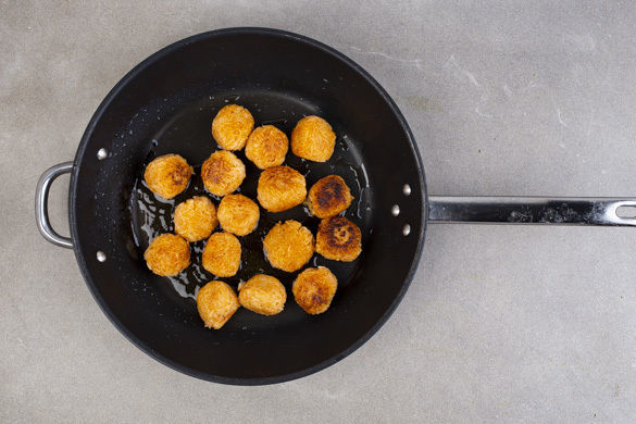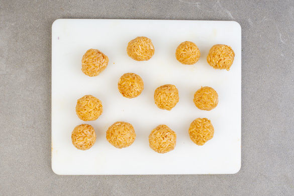 Den gegarten Reis in einem Sieb mit kaltem Wasser abschrecken, dann in einer Schüssel mit 1–2TL Currypaste und 1EL Mehl gut vermengen. Mit einem Esslöffel Portionen abstechen und den Reis mit befeuchteten Händen zu kleinen Bällchen formen. Die Reisbällchen leicht flach drücken.