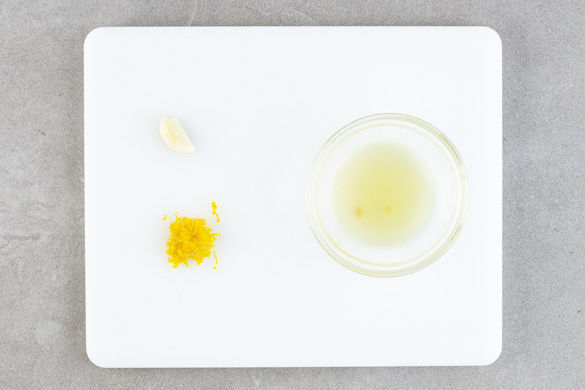 In einem mittelgroßen Topf ausreichend gesalzenes Wasser für die Pasta zum Kochen bringen. Die Zitronenschale abreiben, dann die Zitrone halbieren und auspressen. Den Knoblauch schälen.