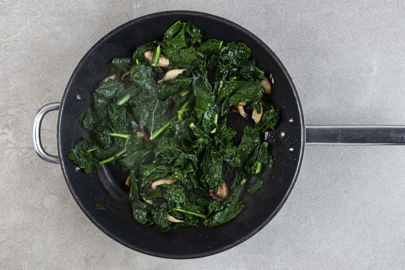 Die Pilze in einer großen Pfanne mit 1–2EL Pflanzenöl bei starker Hitze 2–3Min. anbraten. Den Schwarzkohl dazugeben und 3–4Min. mitbraten, bis er zusammengefallen ist. Mit Salz und Pfeffer würzen.