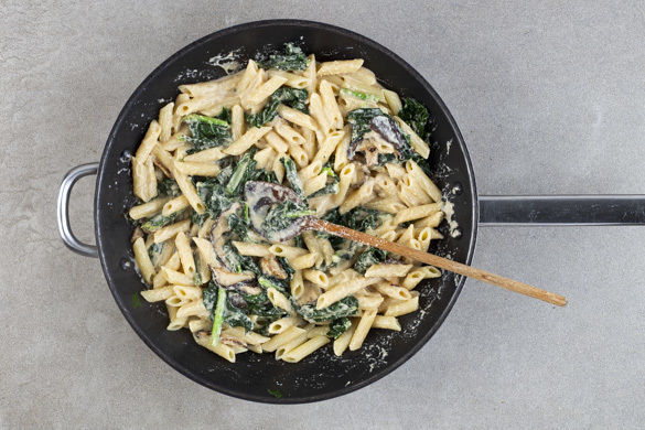 Eine elegante Pasta-Kreation von unserer Köchin Hannah. Die cremige Sauce aus Miso, Cashews, Knoblauch und Zitrone ist frisch und leicht. Dazu gibt es gebratene Shiitakepilze und würzigen Schwarzkohl. Vegane Küche vom Feinsten!