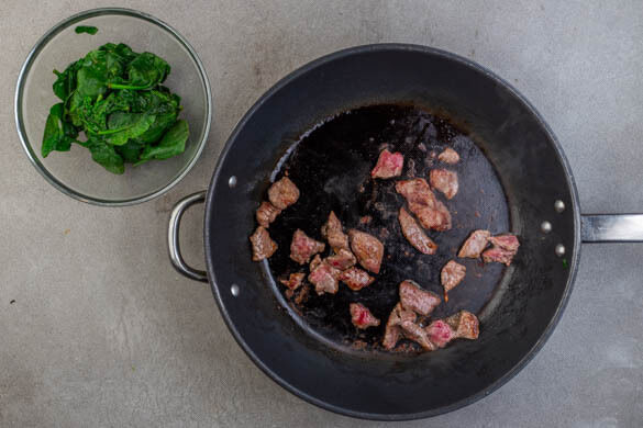 Den Spinat in derselben Pfanne 5–8Min. anbraten, bis er zusammengefallen ist. Ggf. etwas Wasser hinzugeben. Den Spinat anschließend in einer Schüssel mit dem restlichen Sesamöl vermengen. Das Fleisch in derselben Pfanne mit 2EL Pflanzenöl in 3–5Min. goldbraun und gar braten. Auf einem Teller abgedeckt warm halten. Die Pfanne aufbewahren.