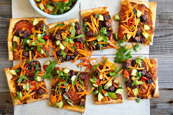 Heute wird das Konzept Pizza mal ganz neu gedacht und auf raffinierte Art asiatisch interpretiert: Auf dem klassischen Teig werden knusprig-süßer Tempeh mit Hoisinsauce und fruchtige Tomatenscheiben gebacken. Garniert wird mit eingelegten Karotten und Gurke, frischen Kräutern und Peperoni. Lecker!