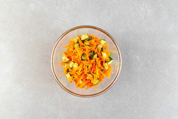 Die Karotte schälen und mit einer Küchenreibe grob raspeln. Die Gurke längs vierteln und in kleine Würfel schneiden. 2EL Essig, 2EL Wasser, 1 Prise Salz und 1TL Zucker verrühren und mit dem Gemüse vermengen.