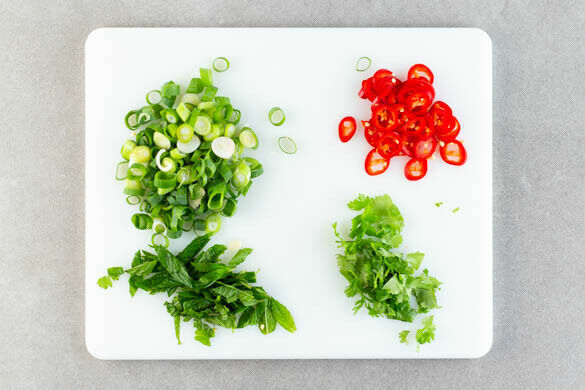 Die Koriander- und die Minzeblätter von den Stängeln zupfen und grob schneiden. Die Lauchzwiebeln in feine Ringe schneiden. Die Peperoni in dünne Ringe schneiden, ggf. für weniger Schärfe die Kerne entfernen.