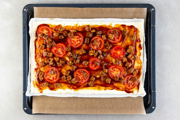 Die Teige mit dem Papier nach unten auf zwei Backblechen ausrollen und mit der Hoisinsauce bestreichen. Die Tomaten und den Tempeh darauf verteilen und die Pizzen 12–15Min. im Ofen backen, bis der Teig gar und knusprig ist. Je nach Ofen die Bleche nach der Hälfte der Zeit tauschen.