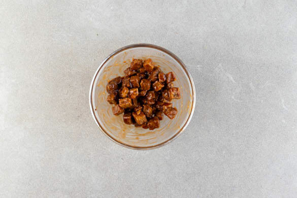 Die BBQ-Sauce mit 2–3EL Wasser verrühren und mit dem Tempeh vermengen.