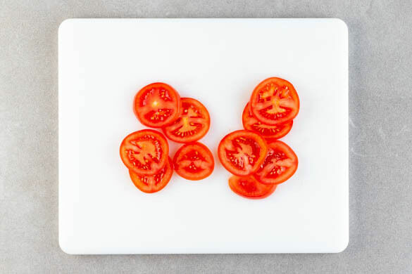 Den Backofen auf 220°C Umluft (240°C Ober-/Unterhitze) vorheizen. Die Tomaten in dünne Scheiben schneiden.