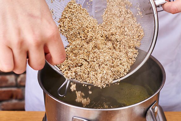 Ofen auf 200°C Ober-/Unterhitze vorheizen. Topf mit 400ml Wasser zum Kochen bringen. Brühwürfel darin auflösen. Quinoa im Sieb unter kaltem Wasser kurz abspülen. Sobald das Wasser kocht, den Quinoa hineingeben, zum Kochen bringen und zugedeckt leicht köchelnd ca. 15Min. bissfest garen. Evtl. überschüssiges Wasser in einem Sieb abtropfen lassen.