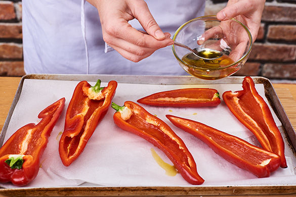 Inzwischen die Paprika der Länge nach halbieren, Kerngehäuse entfernen und mit der Schnittseite nach oben auf ein mit Backpapier ausgelegtes Backblech geben, mit 1-2EL Olivenöl besprenkeln und mit etwas Salz und Pfeffer würzen. Im Ofen ca. 10Min. vorbacken.