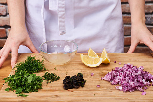 Inzwischen Zwiebel schälen, halbieren und in feine Würfel schneiden. Oliven abtropfen lassen und grob hacken. Kräuter von den harten Stielen streifen und fein hacken. Chili entkernen und 1/3 fein hacken. Wer es schärfer mag, verwendet mehr Chili samt der Kerne. Zitrone halbieren, eine Hälfte auspressen, die andere in Spalten schneiden.