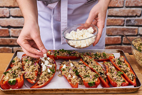 Den Ofen auf 250°C Grill umschalten. Nun den Käse mit den Händen auseinander bröseln und über den gefüllten Paprika verteilen. Die Paprika im Ofen ca. 3-5Min. goldbraun überbacken.