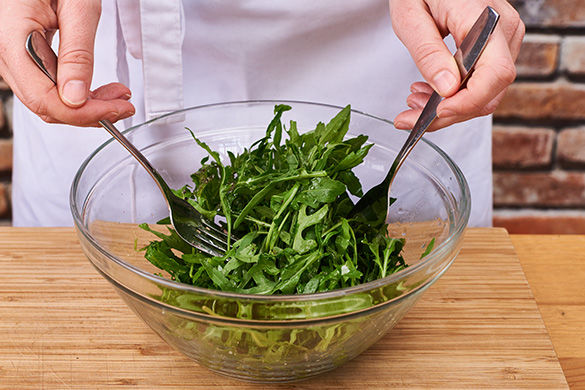 Inzwischen den Rucola mit 1-2EL Olivenöl, Salz und Pfeffer würzen. Paprika mit Rucola und Zitronenspalten anrichten. Zitrone nach Geschmack über den Paprikahälften auspressen.