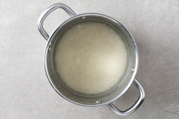 In einem kleinen Topf 300ml leicht gesalzenes Wasser zum Kochen bringen. Den Reis in einem Sieb kalt abspülen, bis das Wasser klar bleibt. Sobald das Wasser kocht, den Reis hineingeben und abgedeckt bei niedrigster Hitze 12–15Min. kochen, bis das Wasser aufgesogen und der Reis gar ist. Noch ca. 5Min. ohne Hitzezufuhr ziehen lassen.