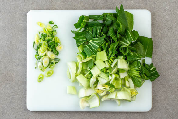 Den Pak Choi vom Strunk befreien und längs halbieren, dann quer in ca. 2cm breite Streifen schneiden. Die Lauchzwiebeln schräg in feine Ringe schneiden.
