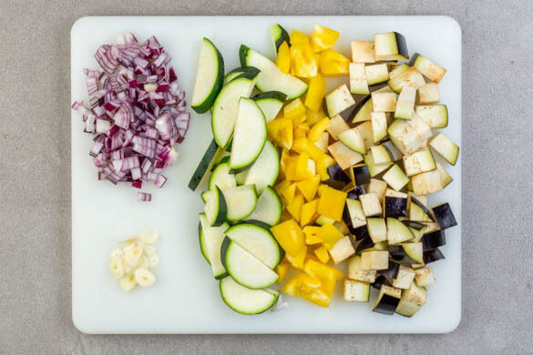 Die Aubergine in ca. 1cm große Würfel schneiden. Die Paprika vierteln, entkernen und in 1–2cm große Stücke schneiden. Die Zucchini längs halbieren, dann quer in 1–2cm breite Scheiben schneiden. Die Zwiebel schälen, halbieren und fein würfeln. Den Knoblauch schälen und in feine Scheibchen schneiden.