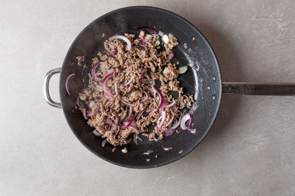 Das Hackfleisch in einer großen Pfanne mit 1EL Pflanzenöl bei mittlerer bis starker Hitze 4–5Min. kross anbraten. Die Zwiebeln und den Knoblauch hinzugeben und 1–2Min. mitbraten. Das Hackfleisch mit dem Currypulver, dem Limettenabrieb, dem Limettensaft nach Geschmack sowie Salz und Pfeffer würzen.