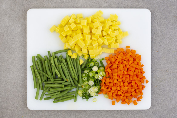 Die Kartoffeln schälen und in ca. 1cm kleine Würfel schneiden. Die Karotten schälen, längs vierteln und in kleine Würfel schneiden. Die Lauchzwiebeln in feine Ringe schneiden.